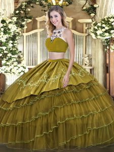 Home >  Quinceanera Dresses >  New Arrival Quinceanera Dresses > Ideal Olive Green High-neck Neckline Beading and Embroidery and Ruffled Layers Quinceanera Dresses Sleeveless Backless