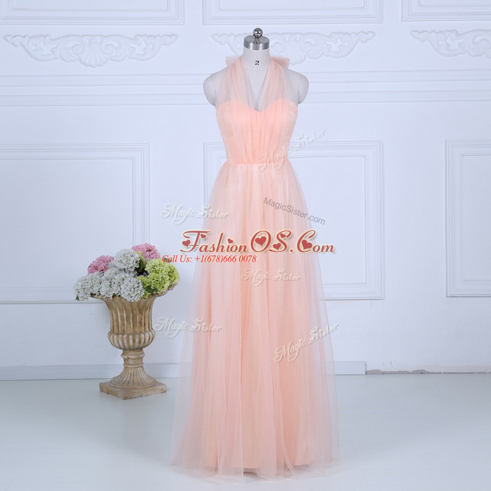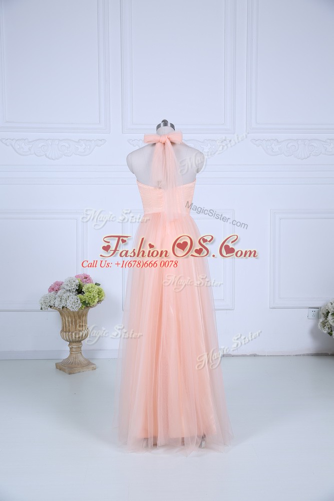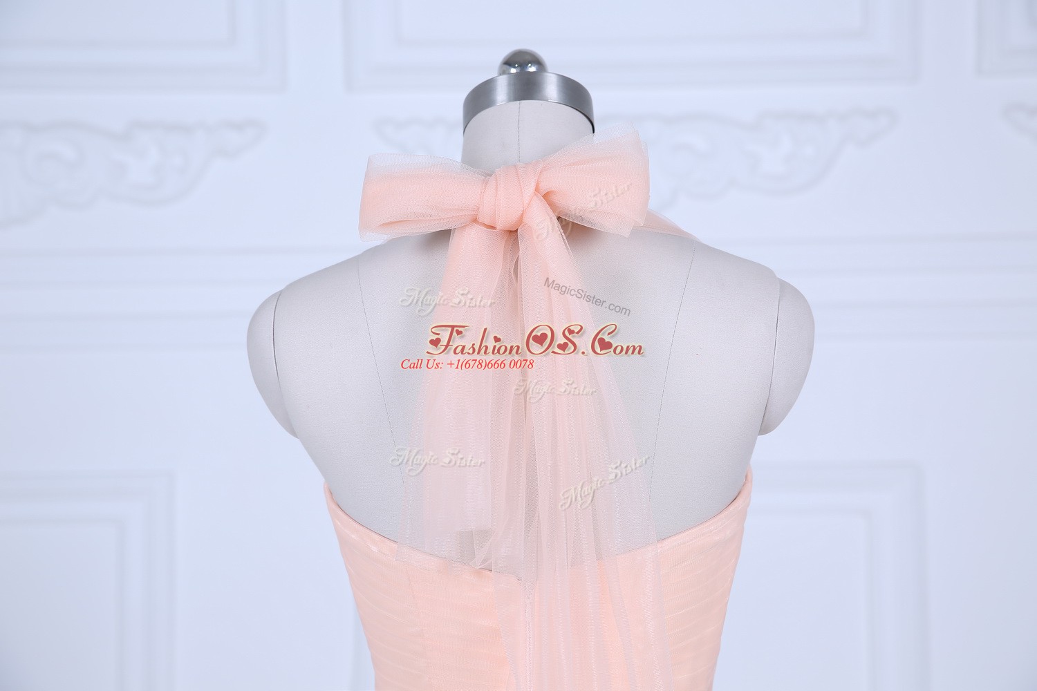 Ideal Peach Sleeveless Floor Length Ruching Zipper Dama Dress for Quinceanera