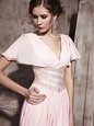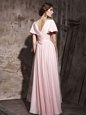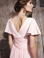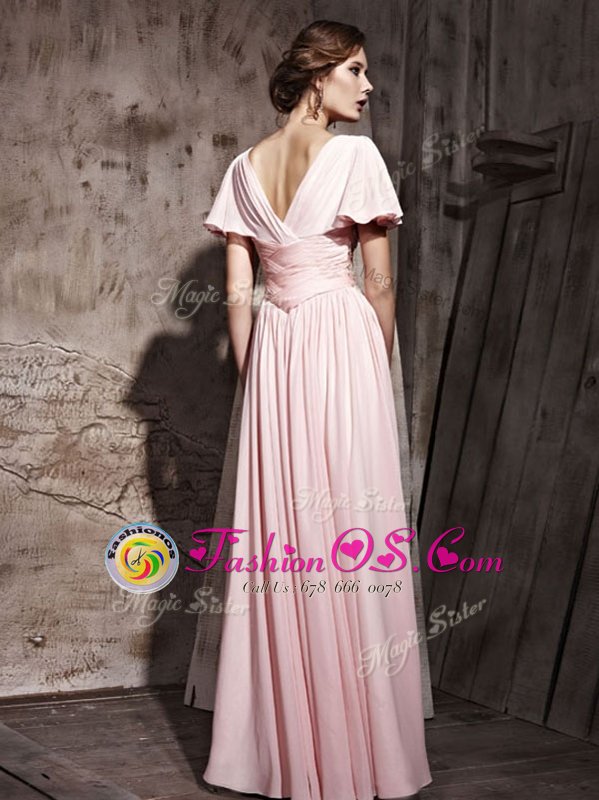 Ideal Pink Column/Sheath V-neck Short Sleeves Chiffon Floor Length Side Zipper Beading and Ruching Evening Dress