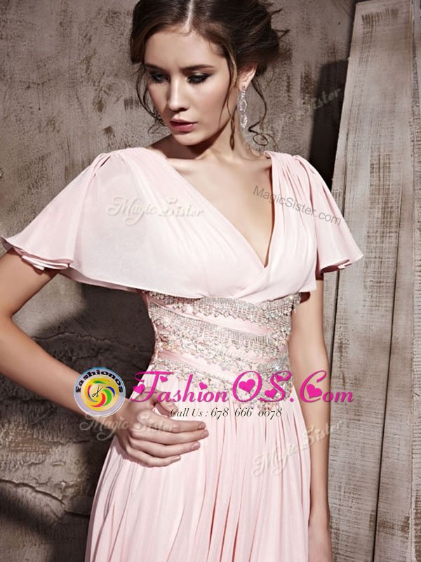 Home >  Prom Dresses >  Perfect Prom Dresses > Ideal Pink Column/Sheath V-neck Short Sleeves Chiffon Floor Length Side Zipper Beading and Ruching Evening Dress
