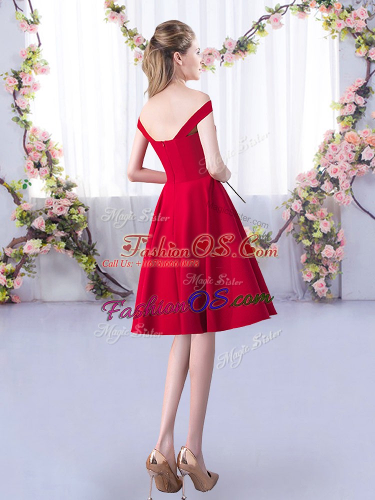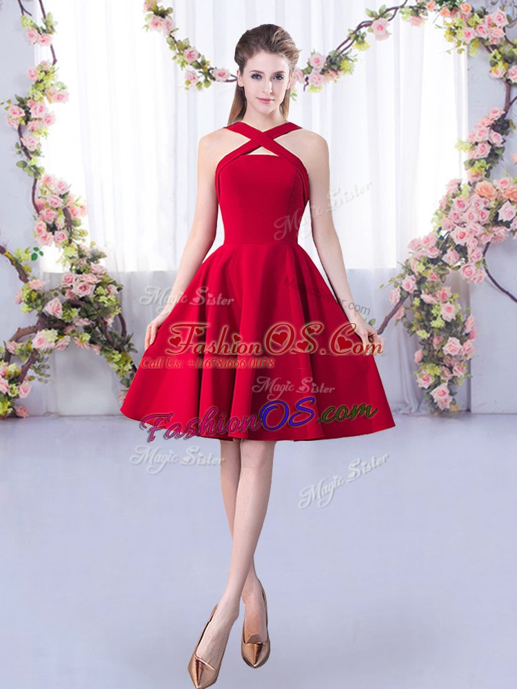 Home >  Bridesmaid Dresses >  Cheap Bridesmaid Dresses > Ideal Straps Sleeveless Wedding Party Dress Knee Length Ruching Red Satin