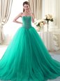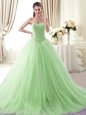 Ideal Tulle Sweetheart Sleeveless Brush Train Lace Up Beading Vestidos de Quinceanera in Apple Green