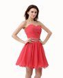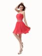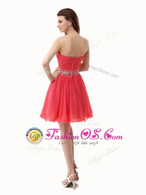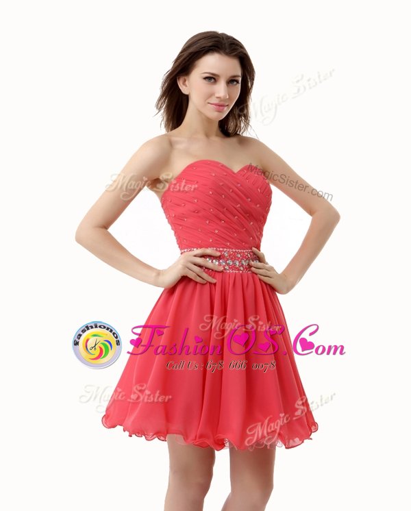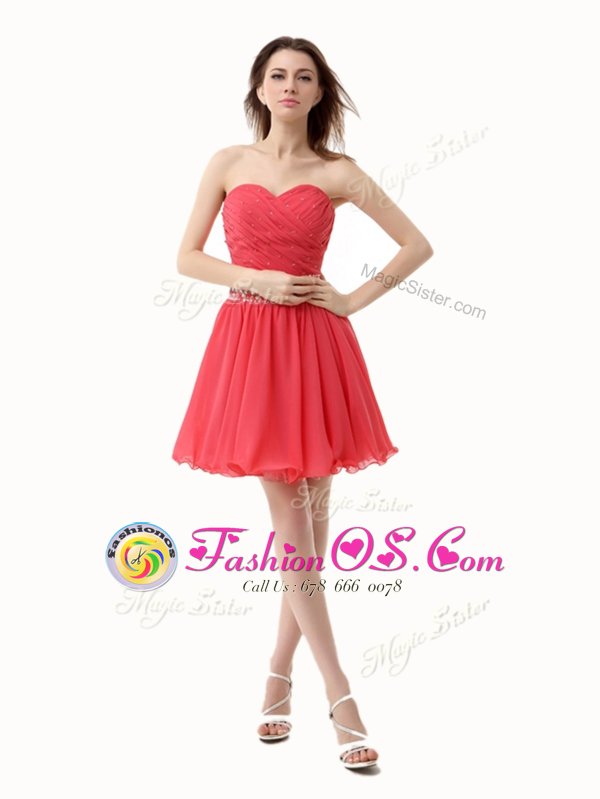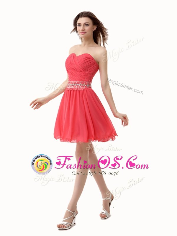 Ideal Watermelon Red Zipper Prom Homecoming Dress Beading and Ruching Sleeveless Mini Length