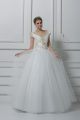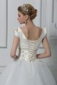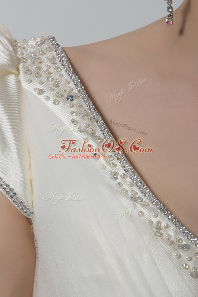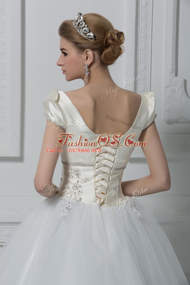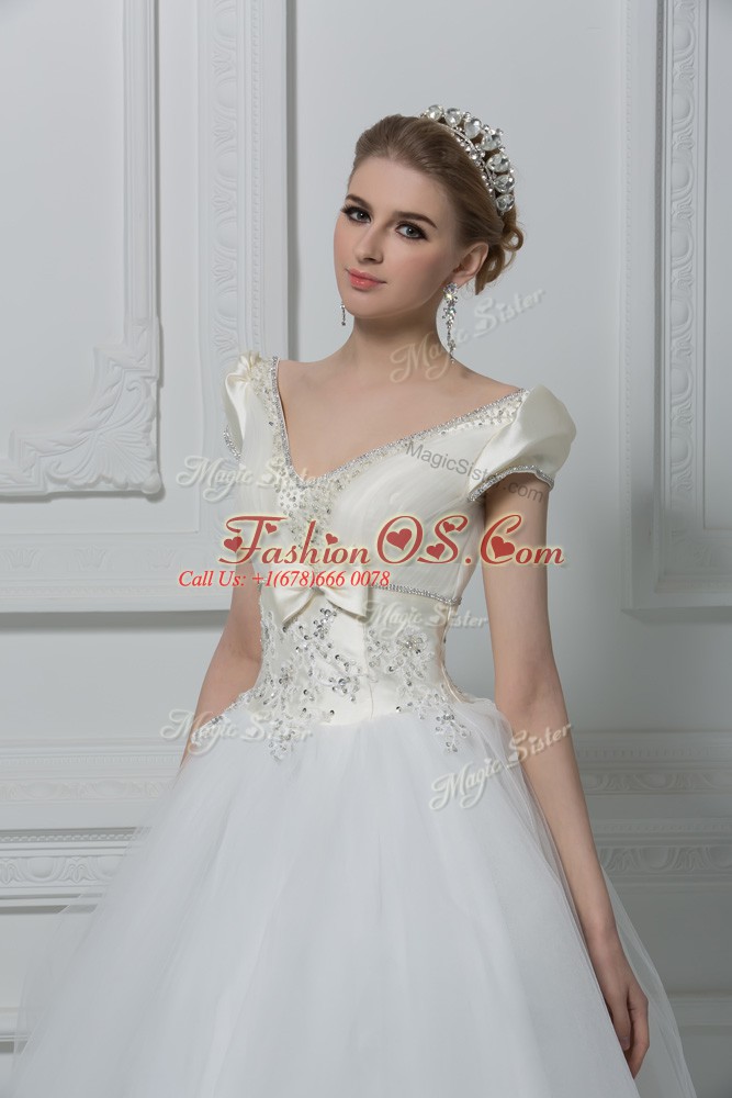 Ideal White Ball Gowns V-neck Short Sleeves Tulle Floor Length Lace Up Beading and Appliques and Bowknot Wedding Dresses