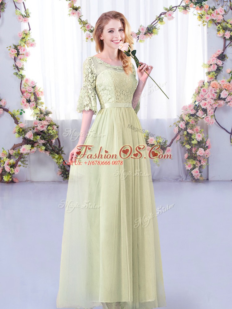 Ideal Yellow Green Quinceanera Court of Honor Dress Wedding Party with Lace and Belt Scoop Half Sleeves Side Zipper