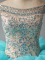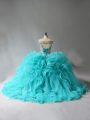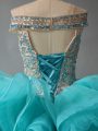Home >  Quinceanera Dresses >  Perfect Quinceanera Dresses > Inexpensive Aqua Blue Ball Gowns Organza Off The Shoulder Sleeveless Beading and Ruffles Lace Up Sweet 16 Quinceanera Dress Brush Train