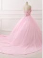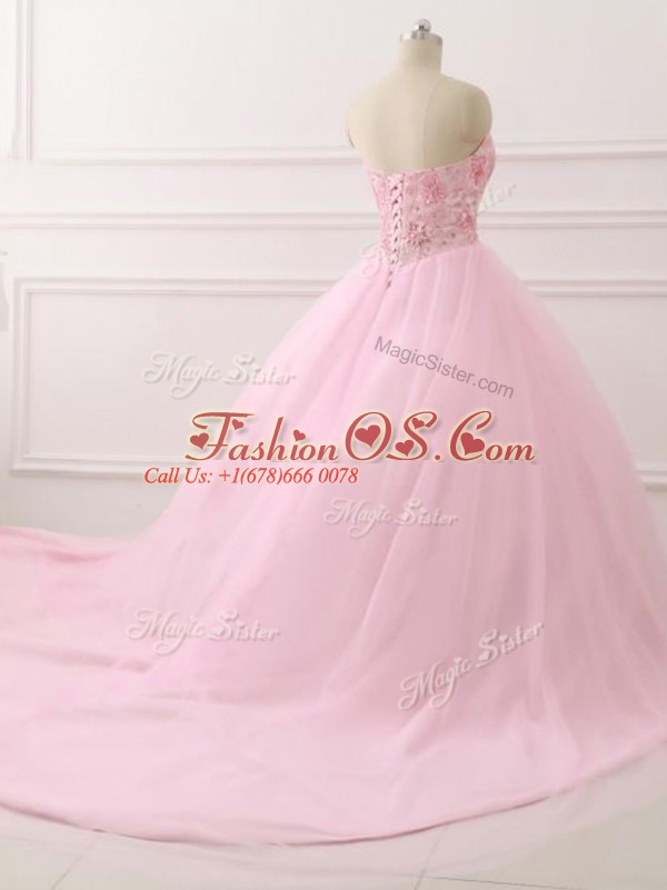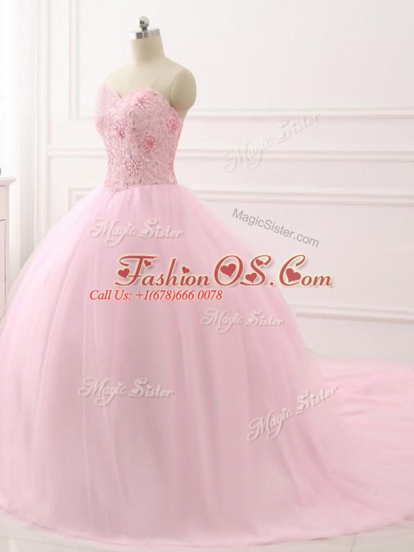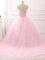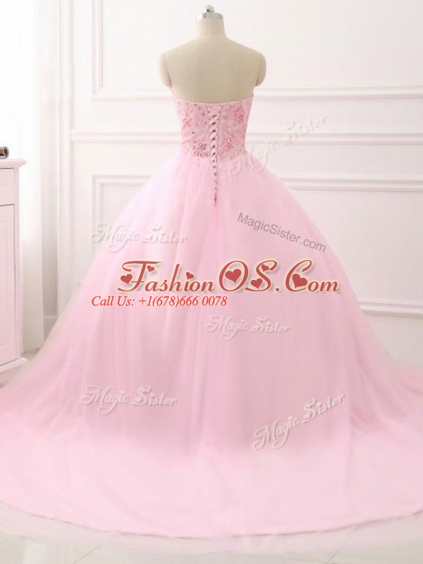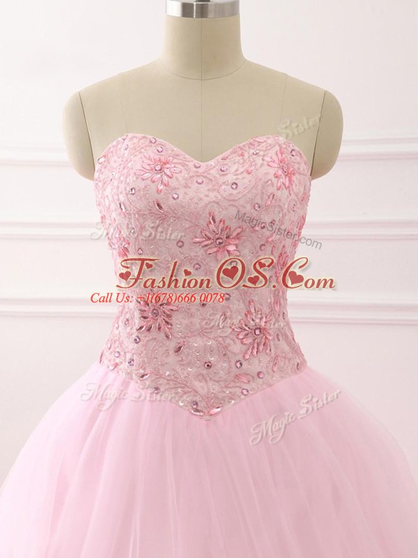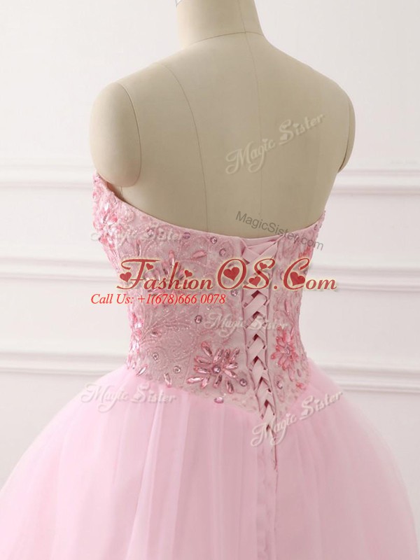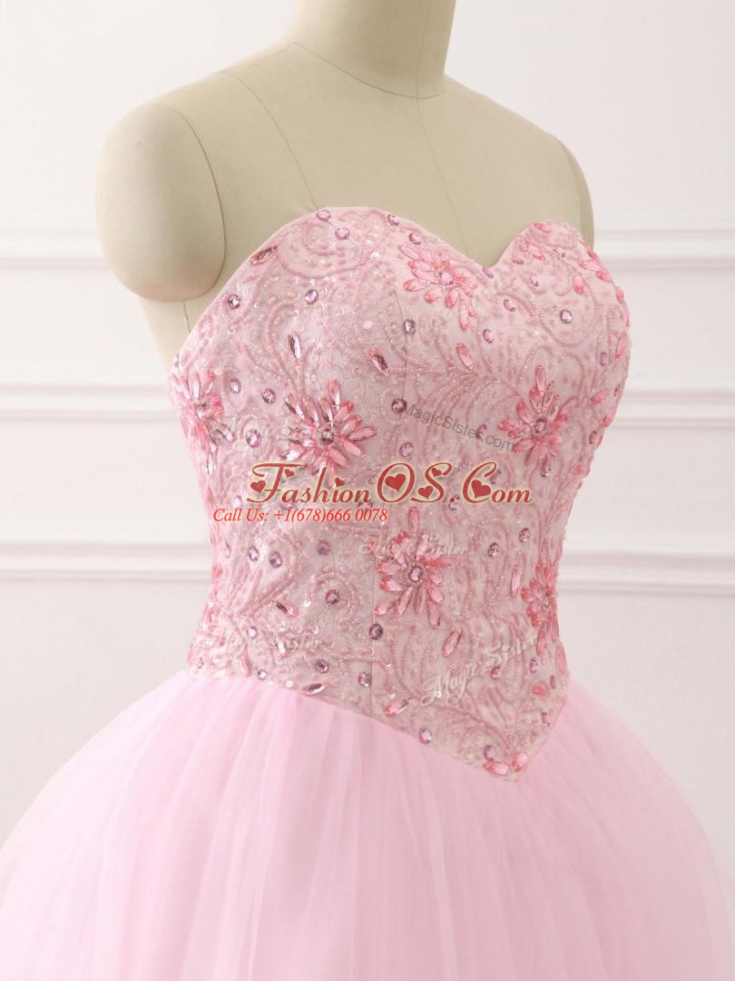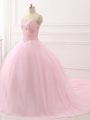 Inexpensive Baby Pink Ball Gowns Sweetheart Sleeveless Tulle Brush Train Lace Up Beading Quinceanera Dresses