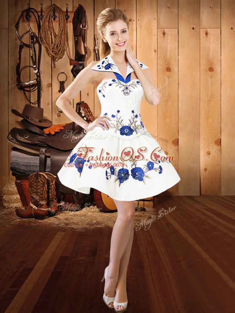 Inexpensive Floor Length Blue And White Vestidos de Quinceanera Halter Top Sleeveless Lace Up