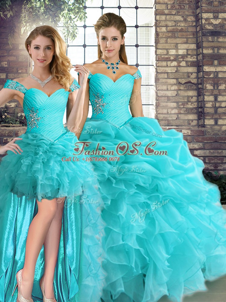 Home >  Quinceanera Dresses >  Detachable Quinceanera Skirts > Inexpensive Floor Length Three Pieces Sleeveless Aqua Blue Vestidos de Quinceanera Lace Up