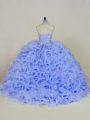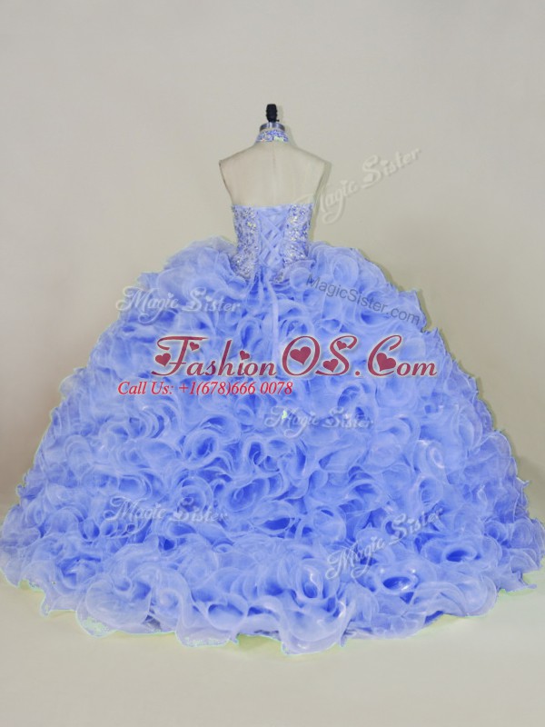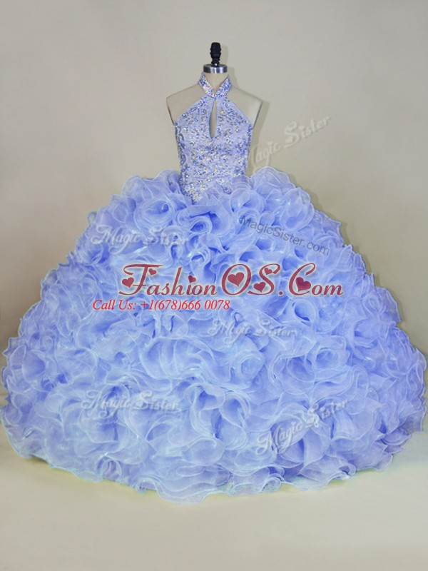 Inexpensive Halter Top Sleeveless Quinceanera Dress Brush Train Beading Lavender Fabric With Rolling Flowers