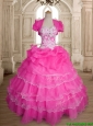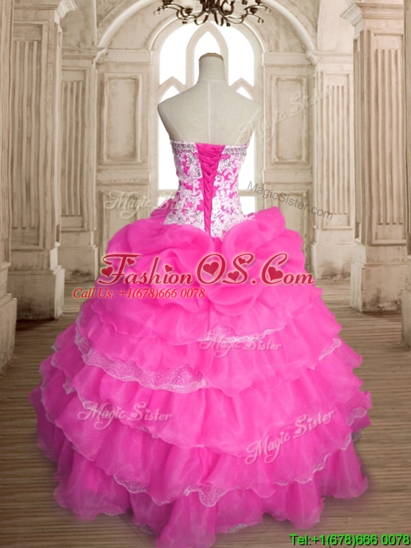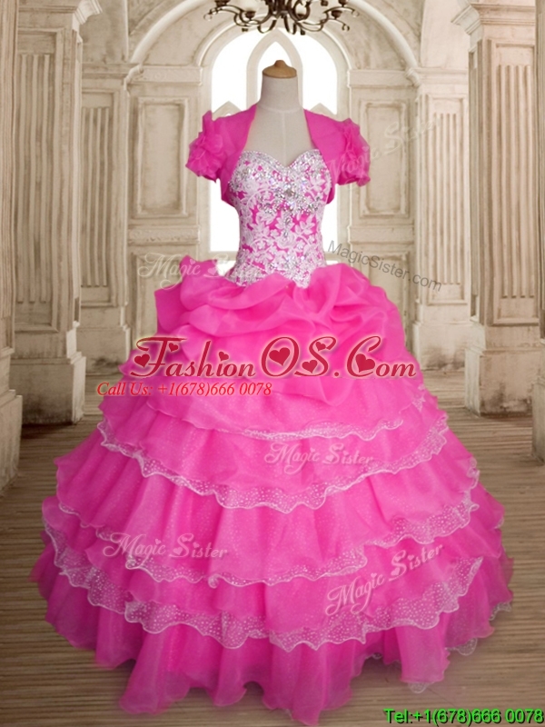 Inexpensive Hot Pink Organza Quinceanera Dress with Ruffled Layers and Beading