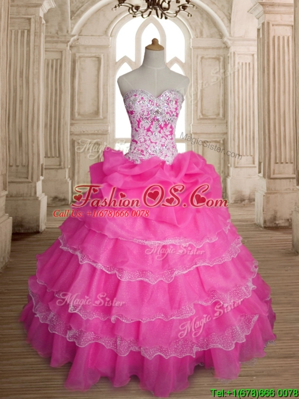 Home >  Quinceanera Dresses >  Fast Delivery Quinceanera Dresses > Inexpensive Hot Pink Organza Quinceanera Dress with Ruffled Layers and Beading