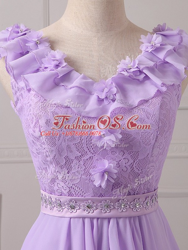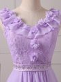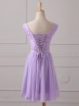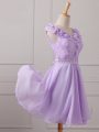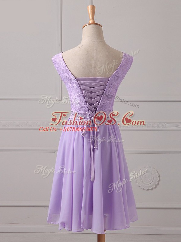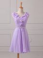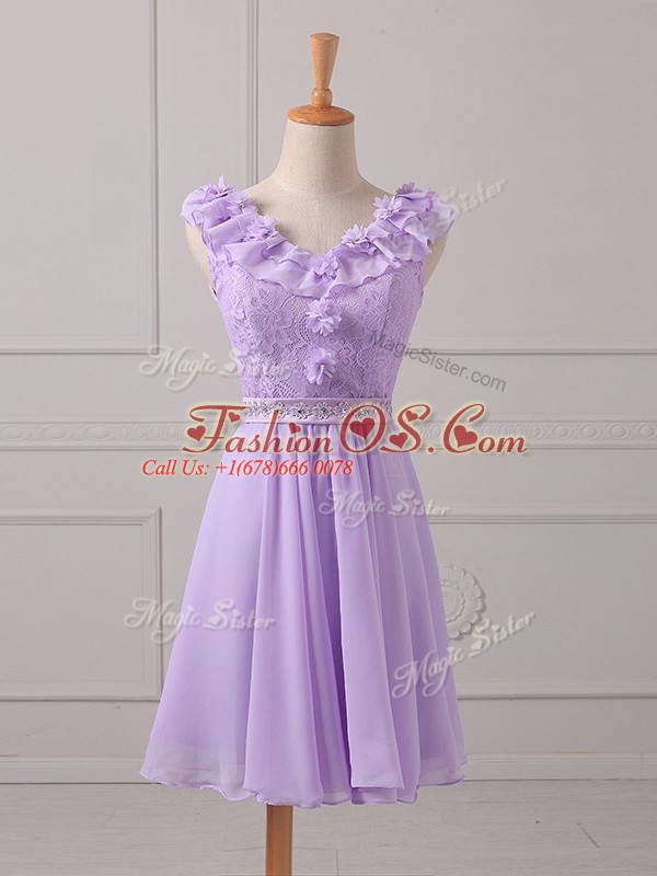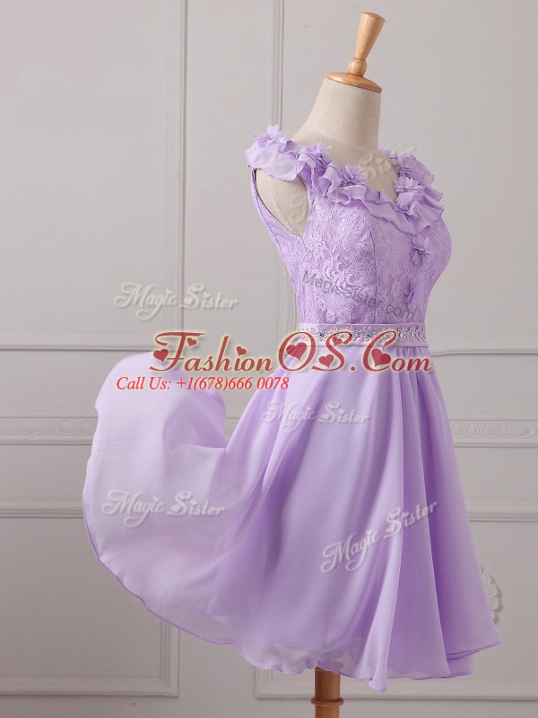 Inexpensive Mini Length Lavender Wedding Guest Dresses Chiffon Sleeveless Lace and Appliques