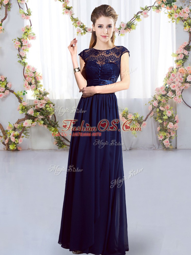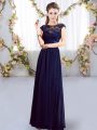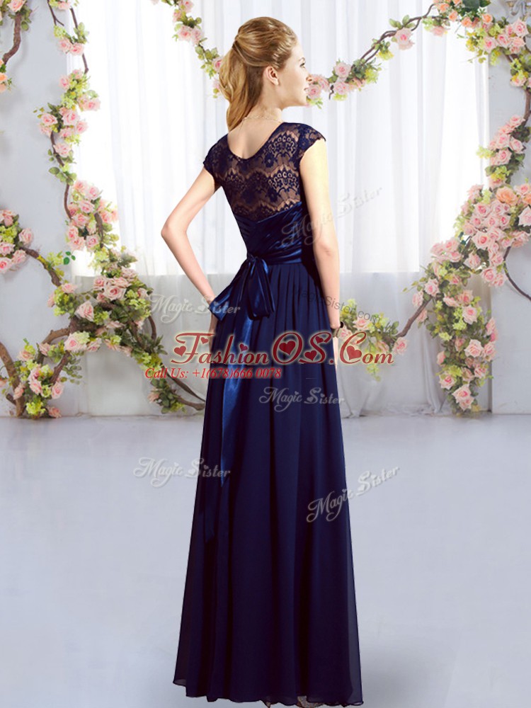 Inexpensive Navy Blue Empire Scoop Cap Sleeves Chiffon Floor Length Zipper Lace and Belt Bridesmaid Dresses