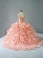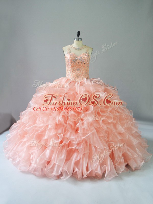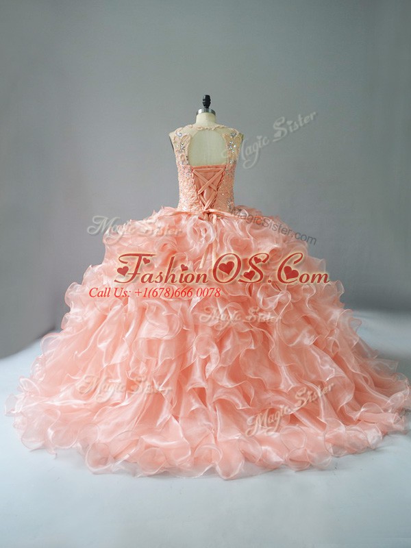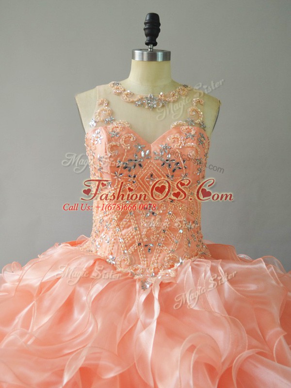 Inexpensive Peach Lace Up Quince Ball Gowns Beading and Ruffles Sleeveless