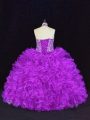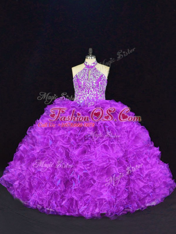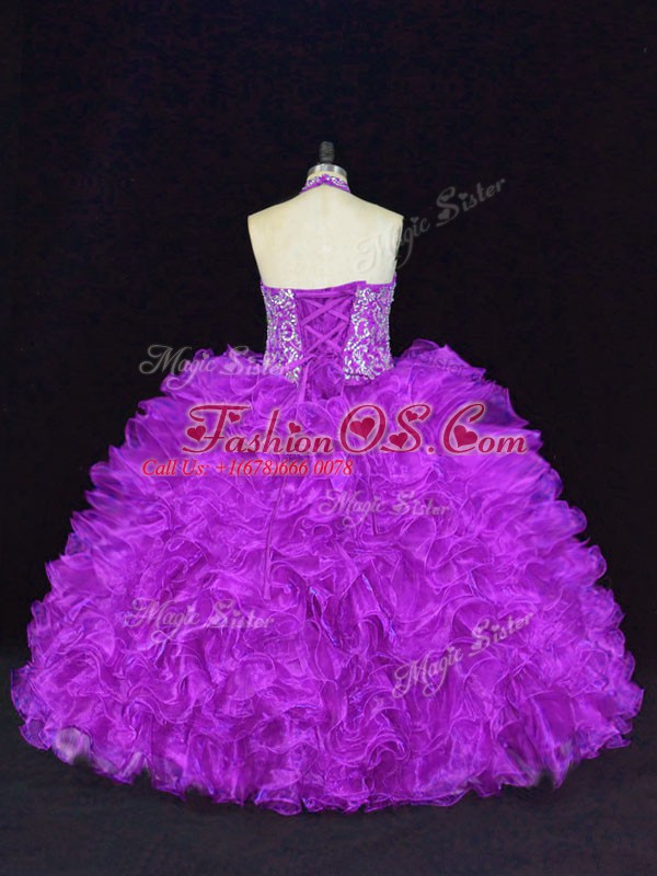 Inexpensive Purple Halter Top Lace Up Beading and Ruffles 15th Birthday Dress Sleeveless