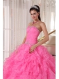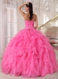 Inexpensive Rose Pink Quinceanera Dress Strapless Organza Beading Ball Gown