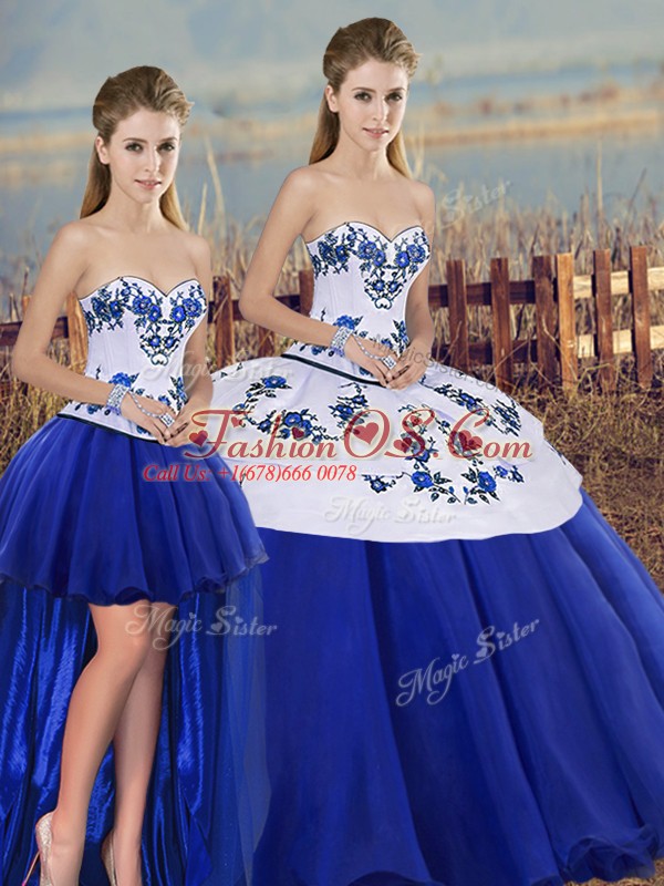 Home >  Quinceanera Dresses >  In Stock Quinceanera Dresses > Inexpensive Royal Blue Three Pieces Tulle Sweetheart Sleeveless Embroidery and Bowknot Floor Length Lace Up Quinceanera Gowns