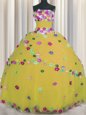 Inexpensive Sleeveless Tulle Floor Length Lace Up Quinceanera Dress in Gold for with Hand Made Flower