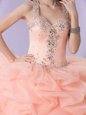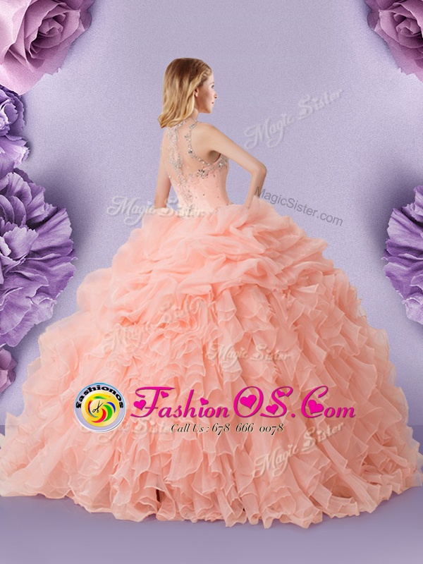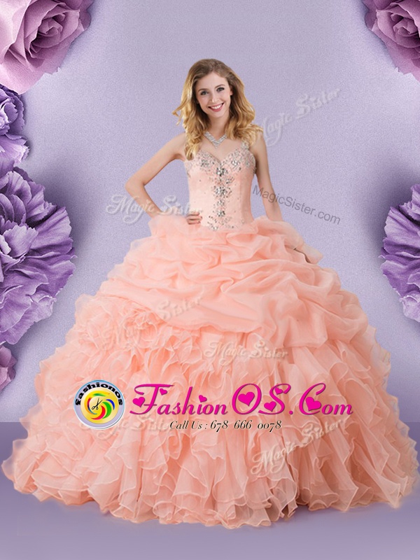 Home >  Quinceanera Dresses >  Fast Delivery Quinceanera Dresses > Inexpensive Straps Pick Ups Floor Length Ball Gowns Sleeveless Peach 15th Birthday Dress Zipper