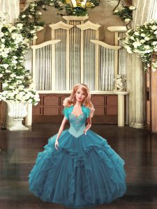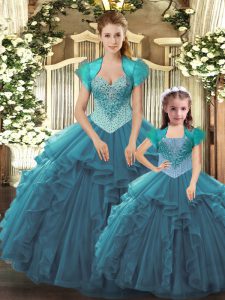 Inexpensive Teal Ball Gowns Straps Sleeveless Tulle Floor Length Lace Up Beading and Ruffles Sweet 16 Dress