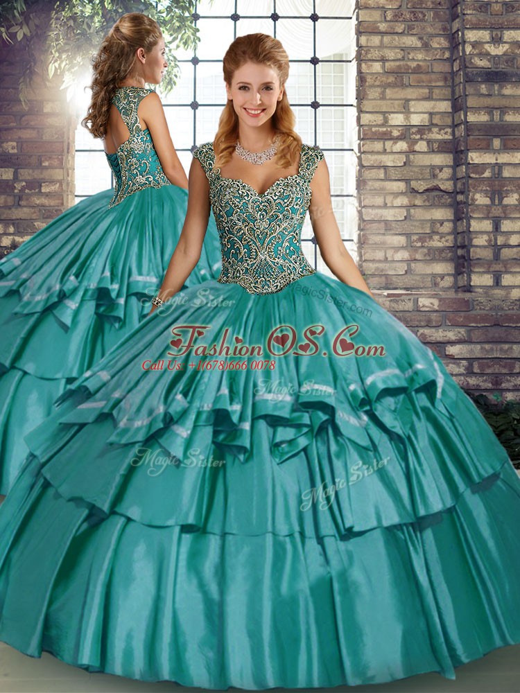 Inexpensive Two Pieces Quinceanera Dresses Teal Straps Taffeta Sleeveless Floor Length Lace Up