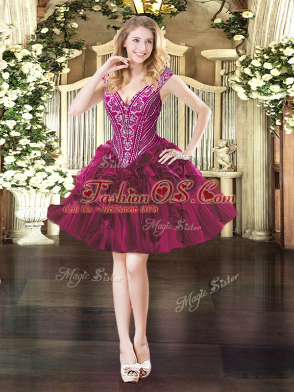 Inexpensive V-neck Sleeveless Lace Up Quinceanera Dresses Fuchsia Organza