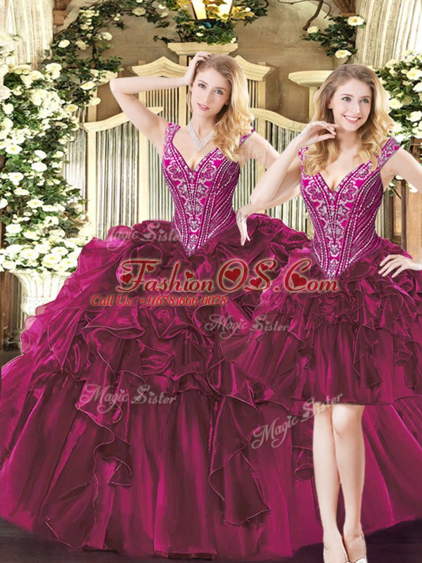 Home >  Quinceanera Dresses >  Detachable Quinceanera Skirts > Inexpensive V-neck Sleeveless Lace Up Quinceanera Dresses Fuchsia Organza