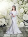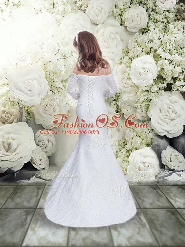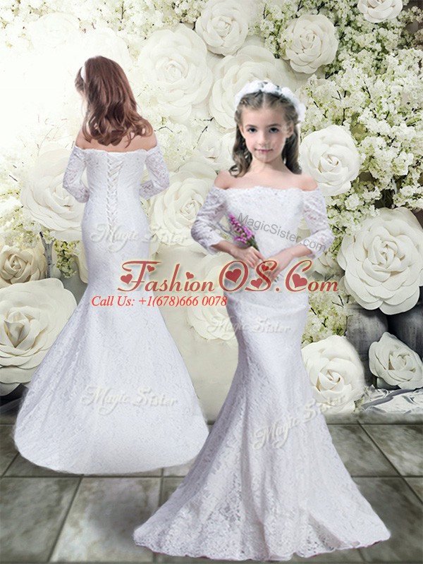 Inexpensive White Mermaid Off The Shoulder 3 4 Length Sleeve Lace Floor Length Lace Up Lace Flower Girl Dress