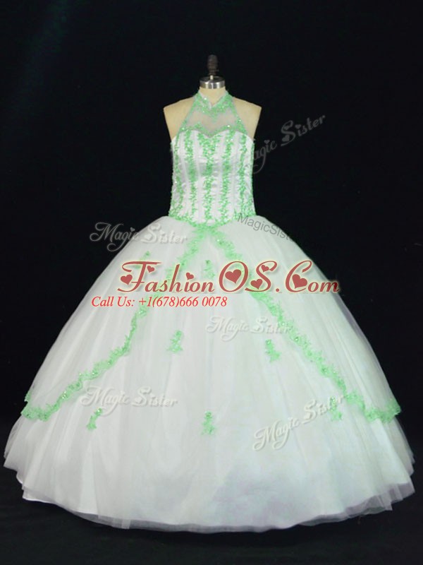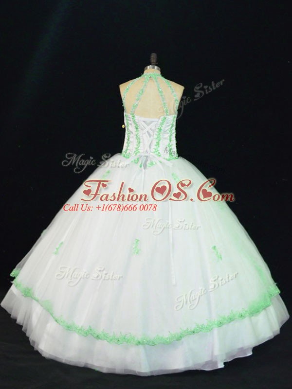 Inexpensive White Sleeveless Floor Length Appliques Lace Up 15th Birthday Dress