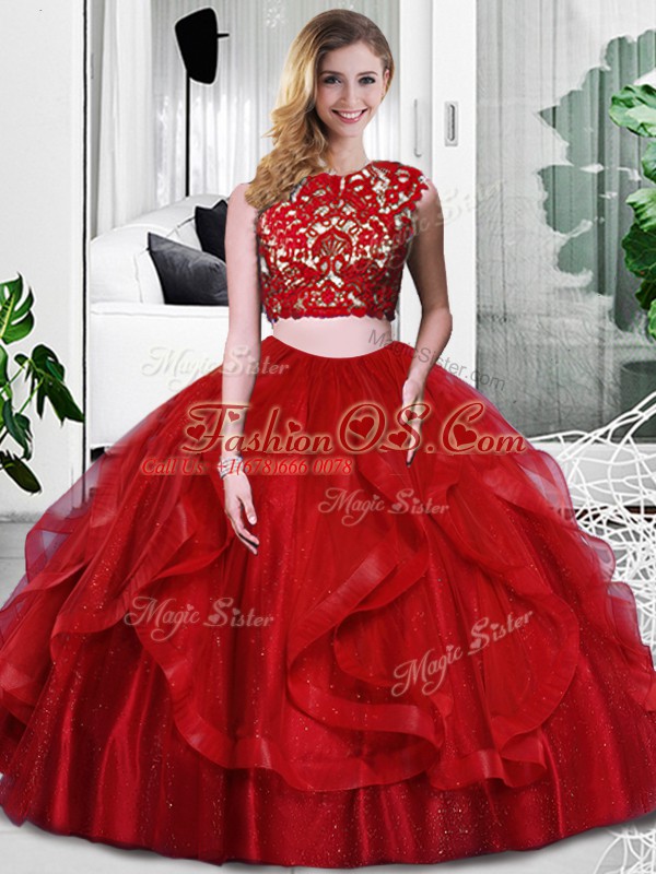 Inexpensive Wine Red Sleeveless Lace and Ruffles Floor Length Sweet 16 Dresses