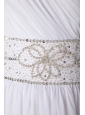 Simply designed dresses can also make a dramatic first impression, this one is a perfect example. It features a one shoulder toga-inspired bodice with a lovely pleated texture. A wide shimmery band adorns the midsection and features intricate beadwork throughout, which attracts countless of appreciated eyes. The floor-length white skirt is made from soft layers of chiffon fabric and moves beautifully with you. A lovely wedding gown completes with elegant lace up closure.