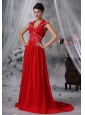 Iowa City Iowa V-neck Beaded Decorate Waist Ruched Decorate Bust Brush Train Red Chiffon For 2013 Prom / Evening Dress