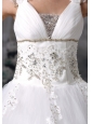 This gorgeous wedding dress features two wide straps with V-neck accents, the thin waistband with appliques on perfectly shown your figure, the outlayer beaded lace which leaves a gap at the midsection makes the dress more graceful. The skirt falls to the floor in A-line style before forming a small pool at your feet in the back. This is a fabulous and elegantly designed gown that would be perfect for your wedding.