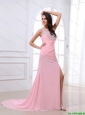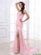 Junior Column Brush Train Prom Dresses with High Slit and Beading