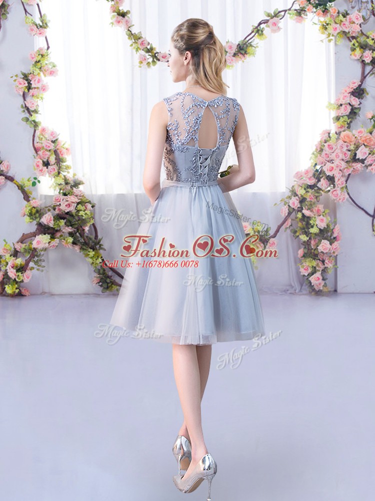 Knee Length Grey Quinceanera Court of Honor Dress Tulle Sleeveless Lace and Belt