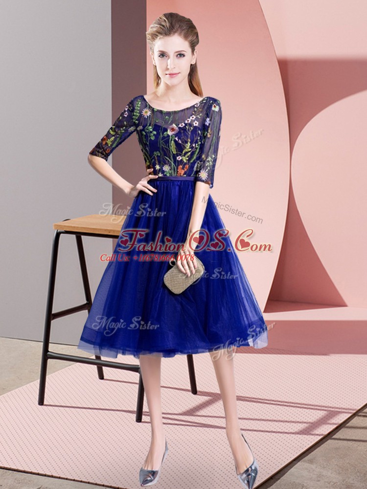 Knee Length Lace Up Wedding Party Dress Blue for Wedding Party with Embroidery