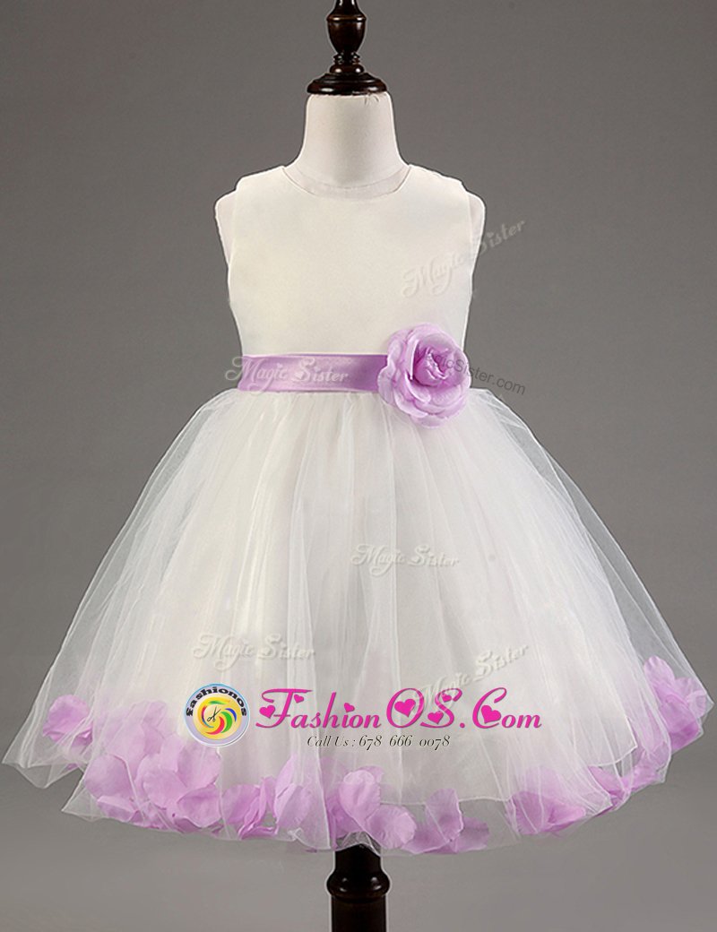 Home >  Special Occasion Dresses >  Cheap Flower Girl Dresses > Knee Length White and Lavender Flower Girl Dresses for Less Square Sleeveless Zipper