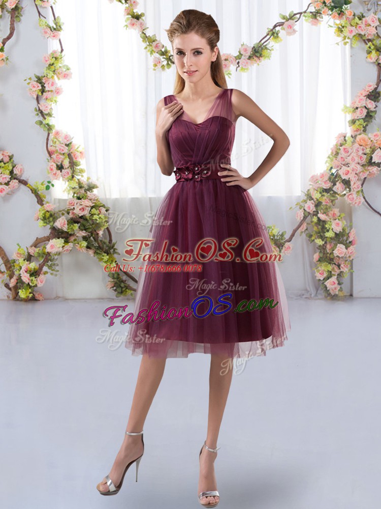 Knee Length Zipper Bridesmaid Gown Burgundy for Prom and Party and Wedding Party with Appliques