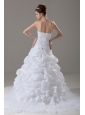 Romantic and luxurious. This white wedding dress features a sexy strapless bodice embellished with delicate lace out layer Sheathy texture will curves your figure perfectly. The A-line skirt is full and shapely, made from many sheer layers of beautiful organza hemmed with lace pattern and bubbles on the taffeta out layer. Lace up tie back secures it in the place.