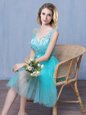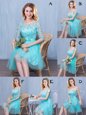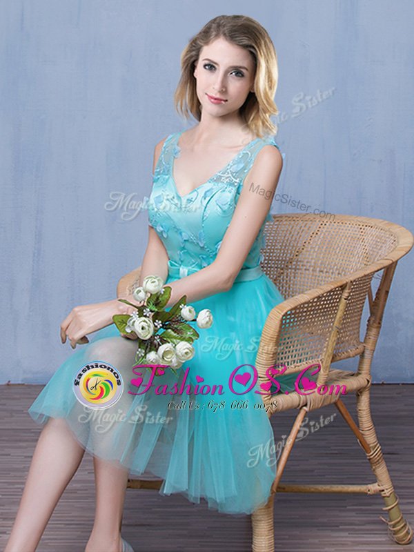 Lace and Appliques and Bowknot Quinceanera Court Dresses Aqua Blue Lace Up Sleeveless Knee Length