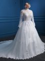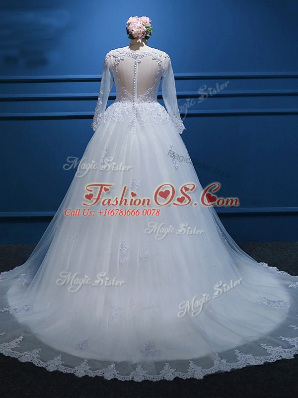 Lace and Appliques Wedding Dress White Zipper Long Sleeves Court Train