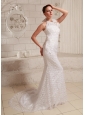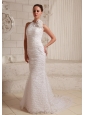 Lace Hand Made Flower Sheath Wedding Dress With Halter Brush Train