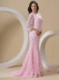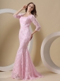Elegant dresses with moderate designs often make a dramatic impression. This lovely dress is no exception. It features a scoop neckline and three quarter sleeves. The baby pink lace for accent is the highlight throughout the dress. This mermaid style is especially beautiful and graceful on tall, thin figures. A hidden zipper makes for easy off and on and secures the dress in place.