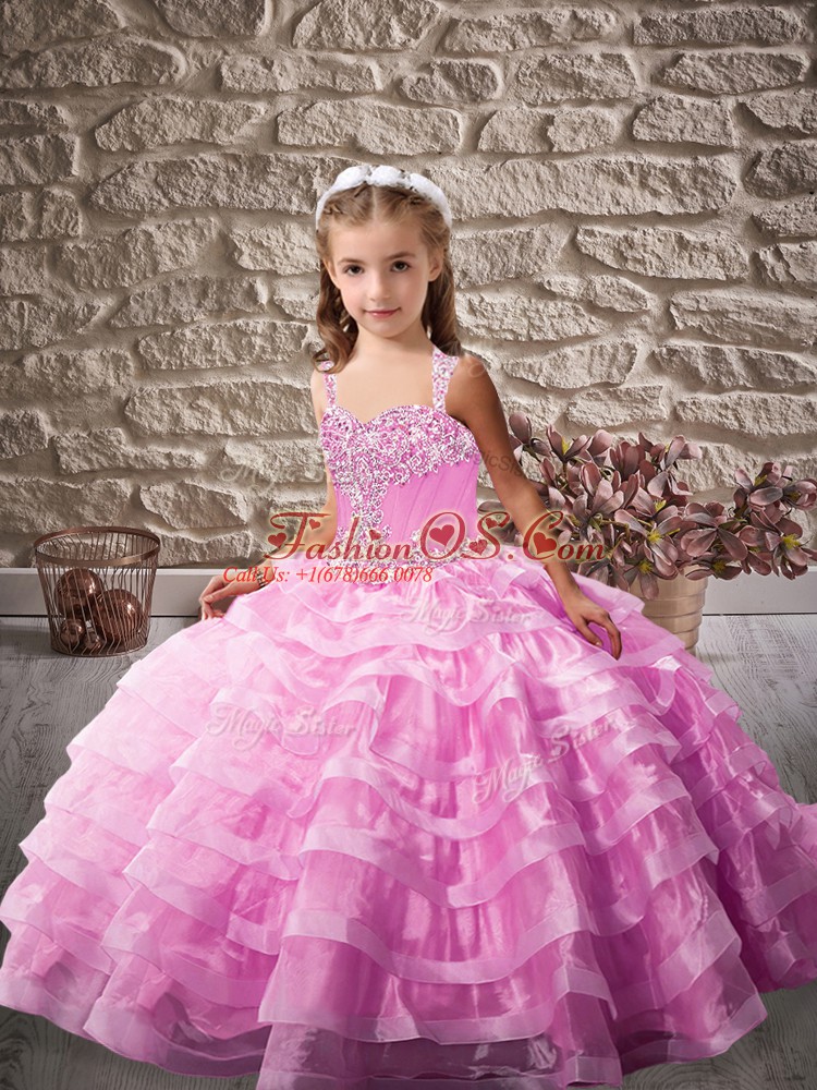 Lace Up Little Girl Pageant Gowns Lilac for Party and Sweet 16 and Wedding Party with Beading and Ruffled Layers Brush Train