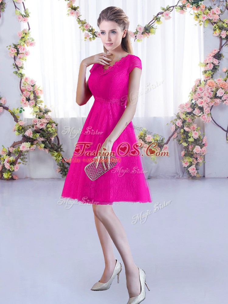 Lace V-neck Cap Sleeves Lace Up Lace Quinceanera Dama Dress in Hot Pink
