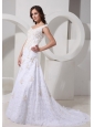 Home >  Wedding Dresses >  Elegant Wedding Dresses > Lace White Off The Shoulder Neckline Brush Train Wedding Dress With Appliques Decorate