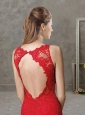 Home >  Prom Dresses >  Modest Prom Dresses > Laced and High Slit Deep V Neckline Red Modest Prom Dress with Brush Train