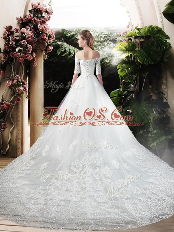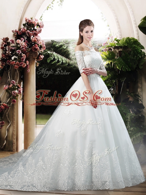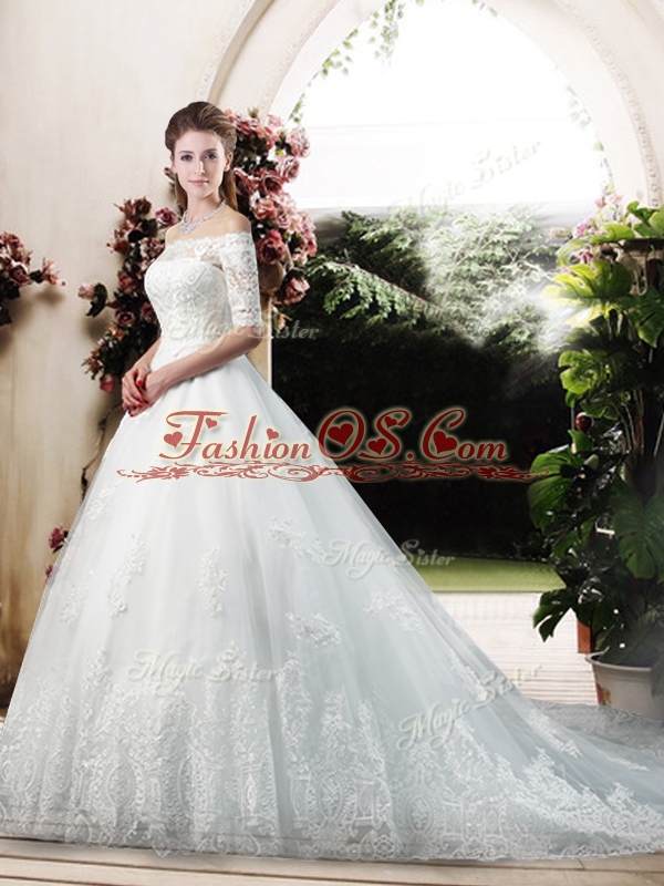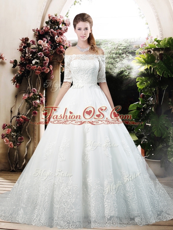 Latest A Line Off the Shoulder Half Sleeves Wedding Dresses with Appliques