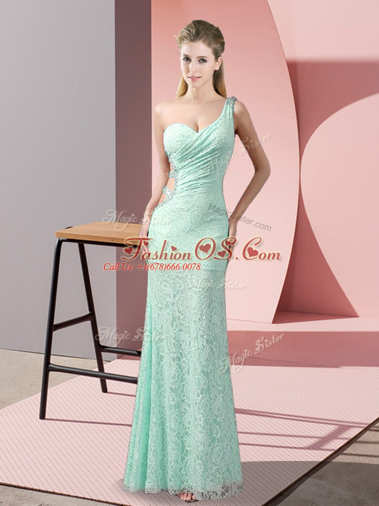 Home >  Prom Dresses >  Christmas Party Dresses > Latest Apple Green Column/Sheath One Shoulder Sleeveless Lace Floor Length Criss Cross Beading and Lace Party Dress for Toddlers